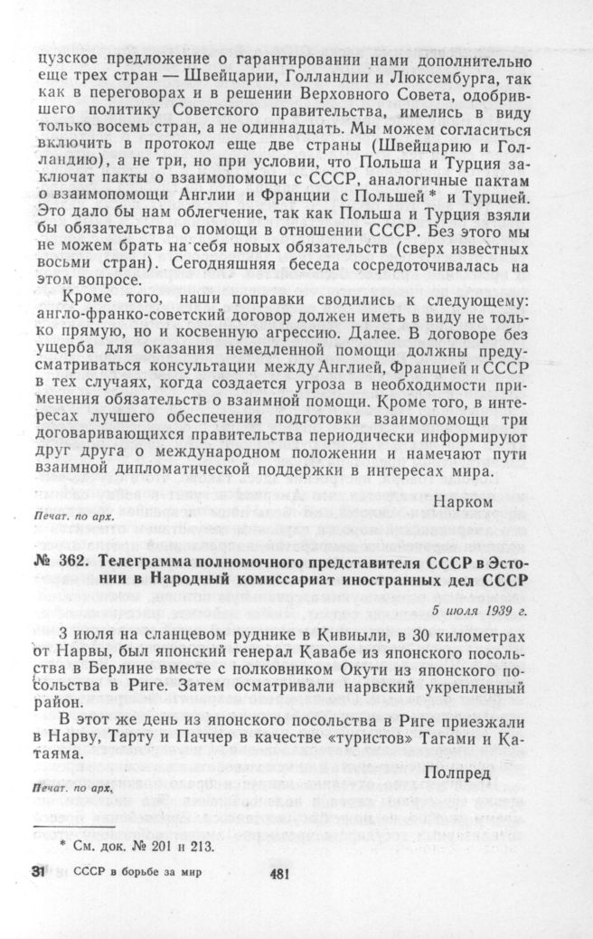 Телеграмма полномочного представителя СССР в Эстонии в Народный комиссариат иностранных дел СССР. 5 июля 1939 г. // Печат. по арх.