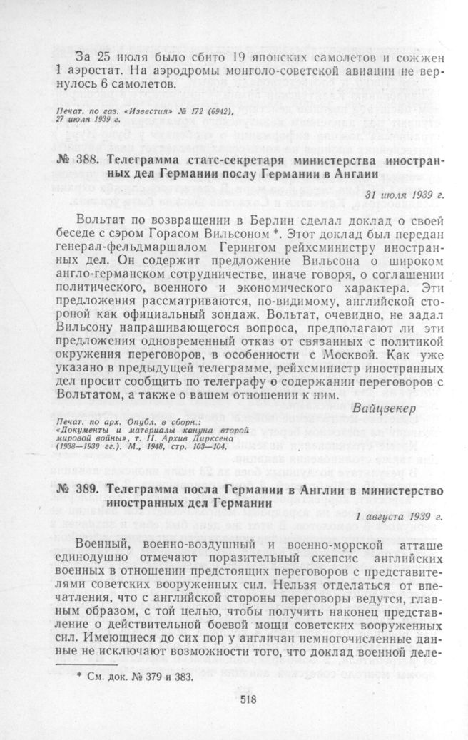 Телеграмма статс-секретаря министерства иностранных дел Германии послу Германии в Англии. 31 июля 1939 г. // Печат. по арх. Опубл. в сборн.: "Документы и материалы кануна второй мировой войны", т. II. Архив Дирксена (1938-1939 гг.). М., 1948, стр. 103-104.