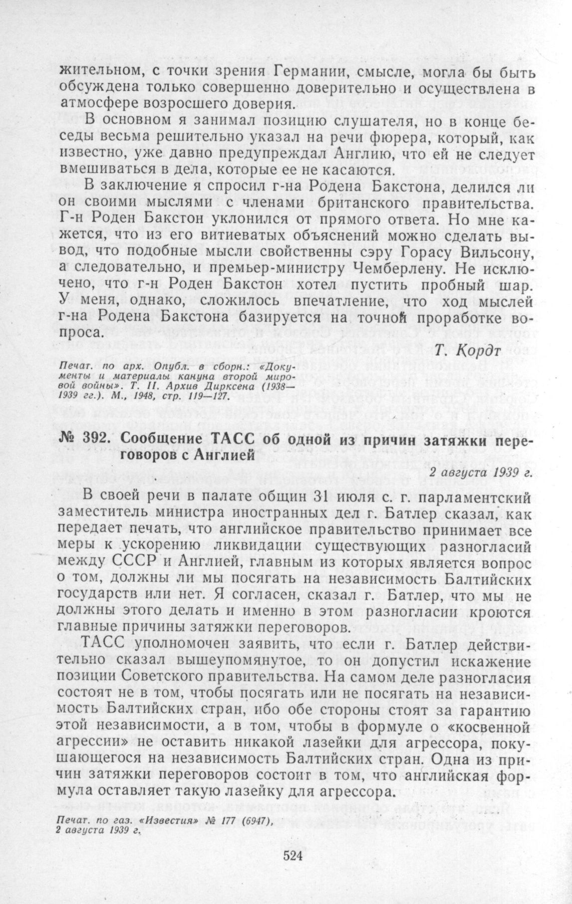 Сообщение ТАСС об одной из причин затяжки переговоров с Англией. 2 августа 1939 г. // Печат. по газ. «Известия», № 177 (6947), 2 августа 1939 г.