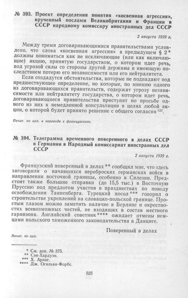 Проект определения понятия «косвенная агрессия», врученный послами Великобритании и Франции в СССР народному комиссару иностранных дел СССР. 2 августа 1939 г. // Печат. по арх. в переводе с французского.