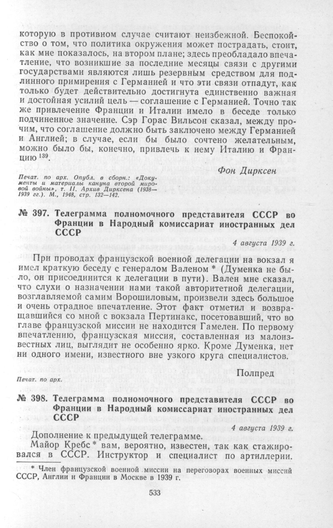 Телеграмма полномочного представителя СССР во Франции в Народный комиссариат иностранных дел СССР [1]. 4 августа 1939 г. // Печат. по арх.