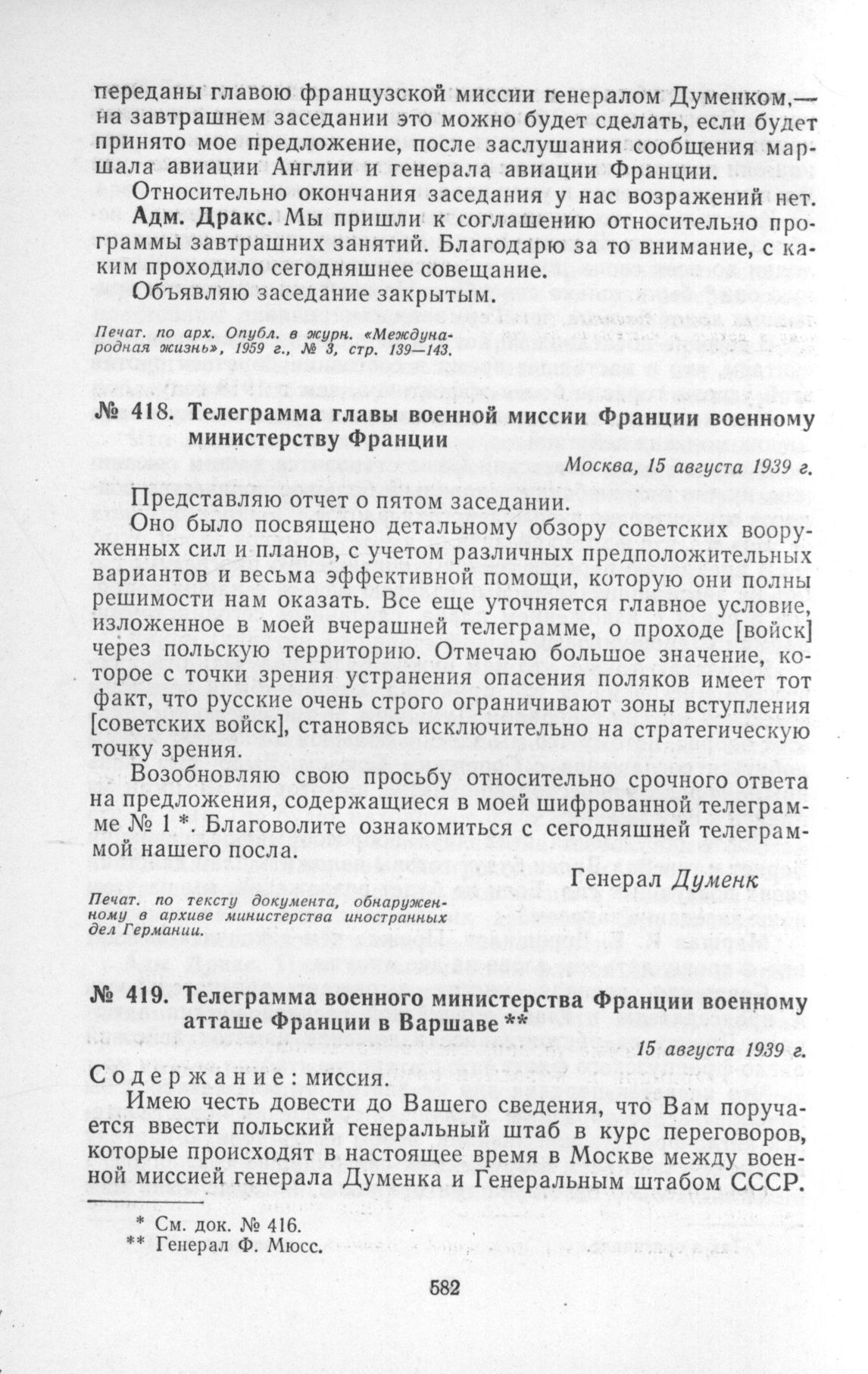 Телеграмма главы военной миссии Франции военному министерству Франции. Москва, 15 августа 1939 г. // Печат. по тексту документа, обнаруженному в архиве министерства иностранных дел Германии.