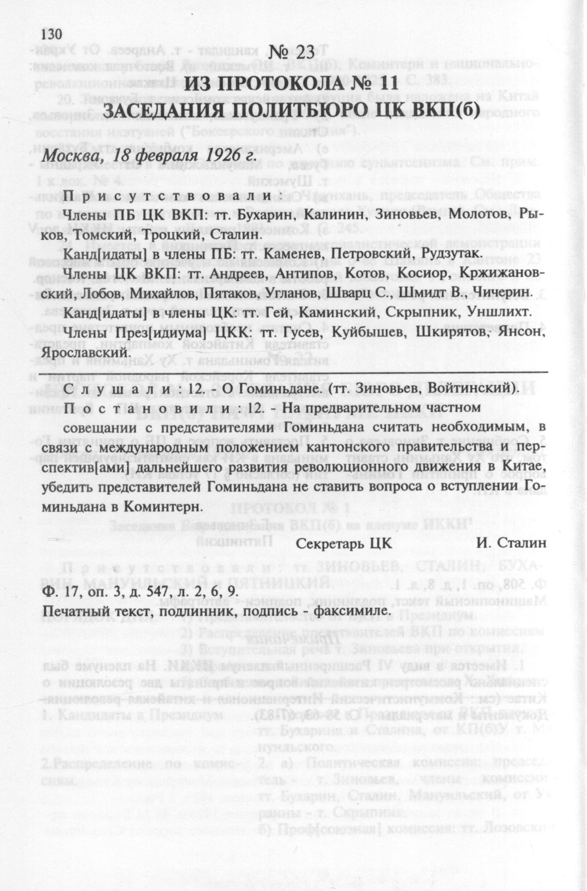 Из протокола № 11 заседания Политбюро ЦК ВКП(б) (18 февраля 1926 г.) // РЦХИДНИ, ф. 17, оп. 3, д. 547, л. 2, 6, 9. Печатный текст, подлинник, подпись - факсимиле.