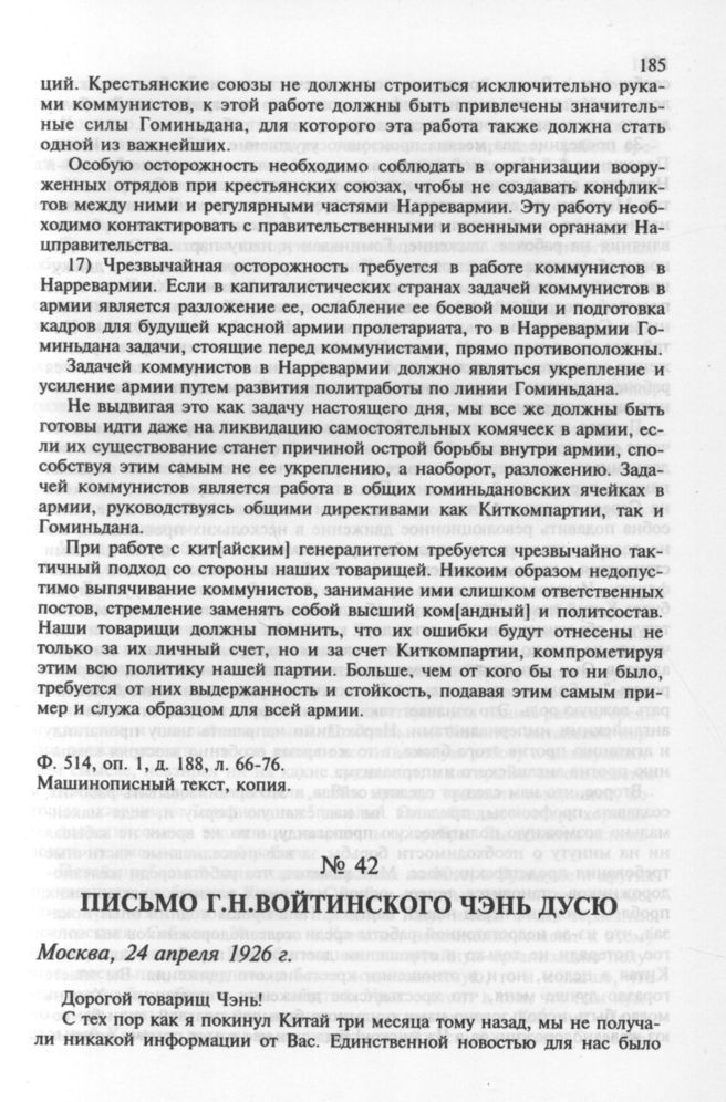 Письмо Г.Н.Войтинского Чэнь Дусю (24 апреля 1926 г.) // РЦХИДНИ, ф. 495, оп. 154, д. 275, л. 209-213. Машинописный текст на английском языке, копия, без подписи.