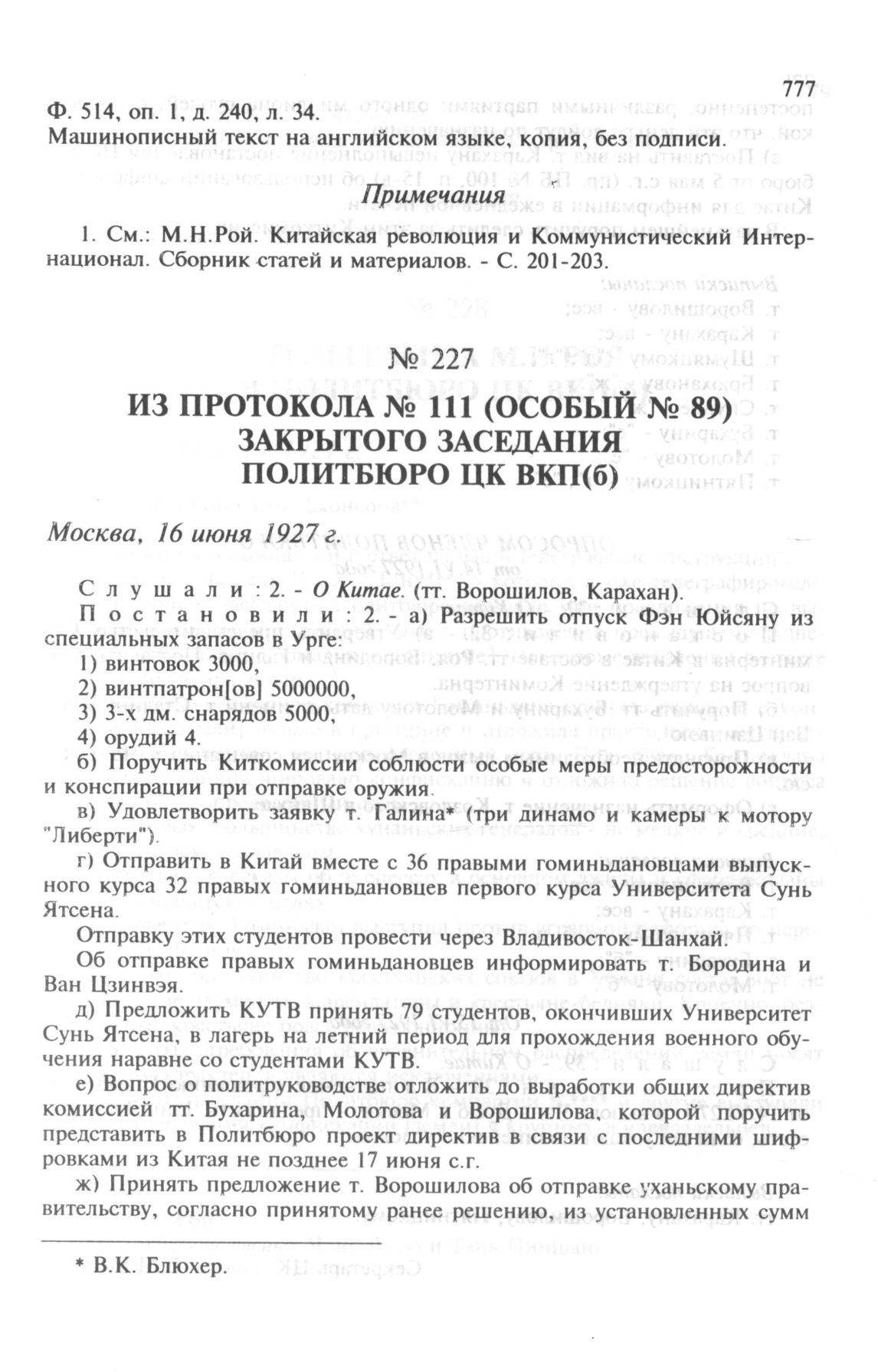 Из протокола № 111 (Особый № 89) закрытого заседания Политбюро ЦК ВКП(б) (16 июня 1927 г.) // РЦХИДНИ, ф. 17, оп. 162, д. 5, л. 39, 41, 42, 51. Машинописный текст, подлинник, подпись - факсимиле.