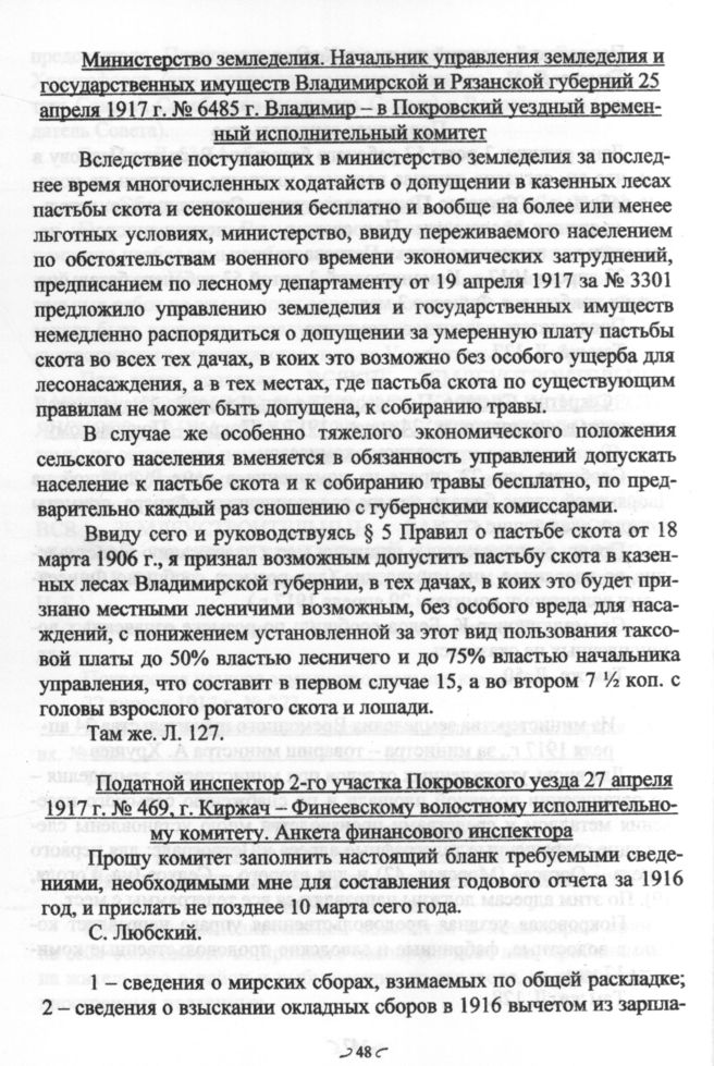 Податной инспектор 2-го участка Покровского уезда 27 апреля 1917 г. № 469. г. Киржач - Финеевскому волостному исполнительному комитету. Анкета Финансового инспектора // ГАВО. Ф. 1086. Oп. 1. Д. 4. Л. 47-48.