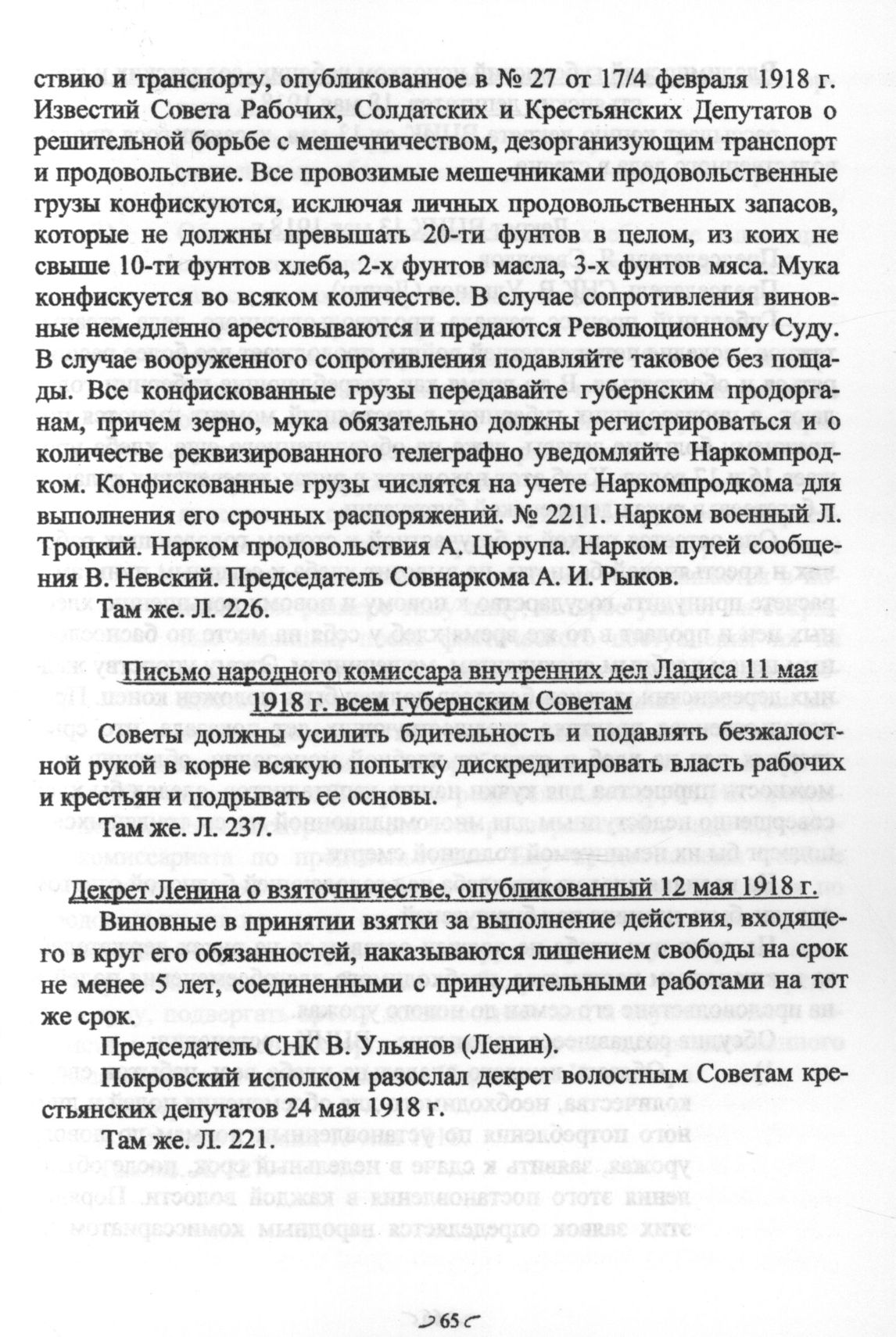 Декрет Ленина о взяточничестве, опубликованный 12 мая 1918 г. // ГАВО. Ф. 1086. Oп. 1. Д. 4. Л. 221.