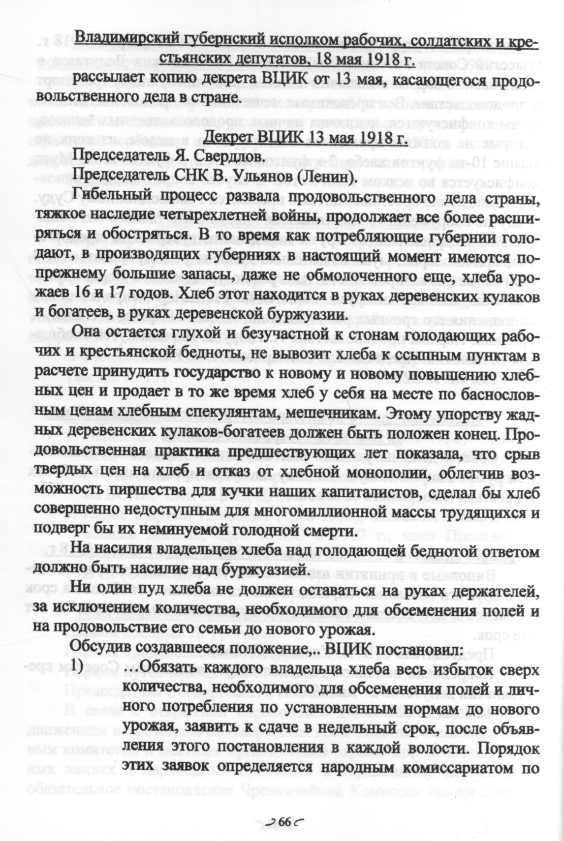 Владимирский губернский исполком рабочих, солдатских и крестьянских депутатов. 18 мая 1918 г. Декрет ВЦИК 13 мая 1918 г. // ГАВО. Ф. 1086. Oп. 1. Д. 4. Л. 227.