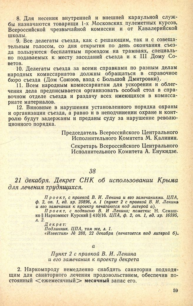 Наблюдение за отбором больных рабочих, а также за размещением их в санаториях в Крыму, возложить на Всероссийский центральный совет профессиональных союзов совместно с Наркомздравом, поручив им привлечь к этой работе представителей профсоветов Петрограда, Москвы, Иваново, Вознесенска, Харькова и Донбасса.
