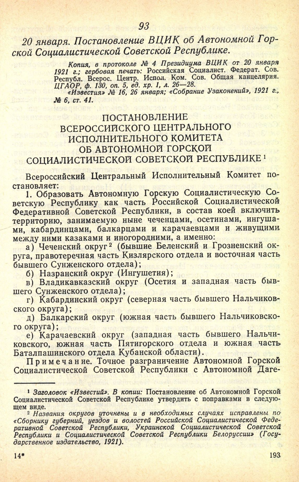 - 1. ↑ Заголовок «Известий». В копии: Постановление об Автономной Горской Социалистической Советской Республике утвердить с поправками в следующем виде.