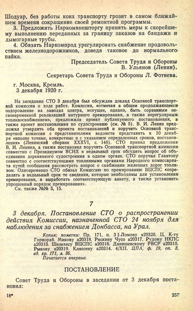 3 декабря. Постановление СТО о распространении действия Комиссии, назначенной СТО 24 ноября для наблюдения за снабжением Донбасса, на Урал.
