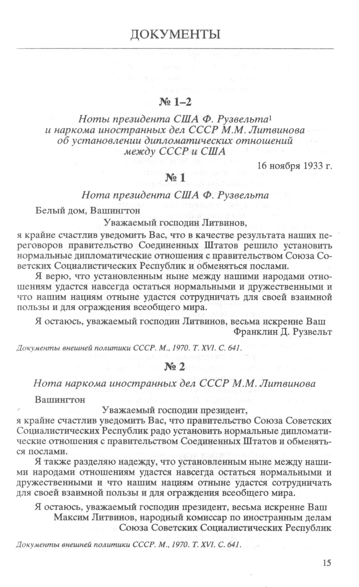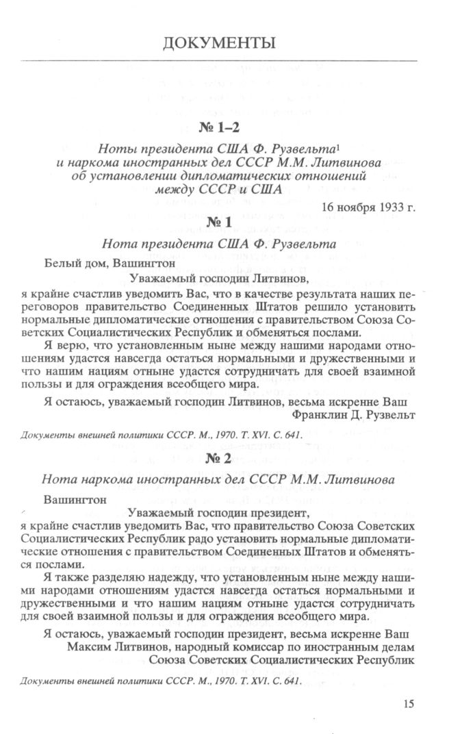 Нота президента США Ф. Рузвельта об установлении дипломатических отношений между СССР и США. 16 ноября 1933 г. // Документы внешней политики СССР. М., 1970. Т. XVI. С. 641.