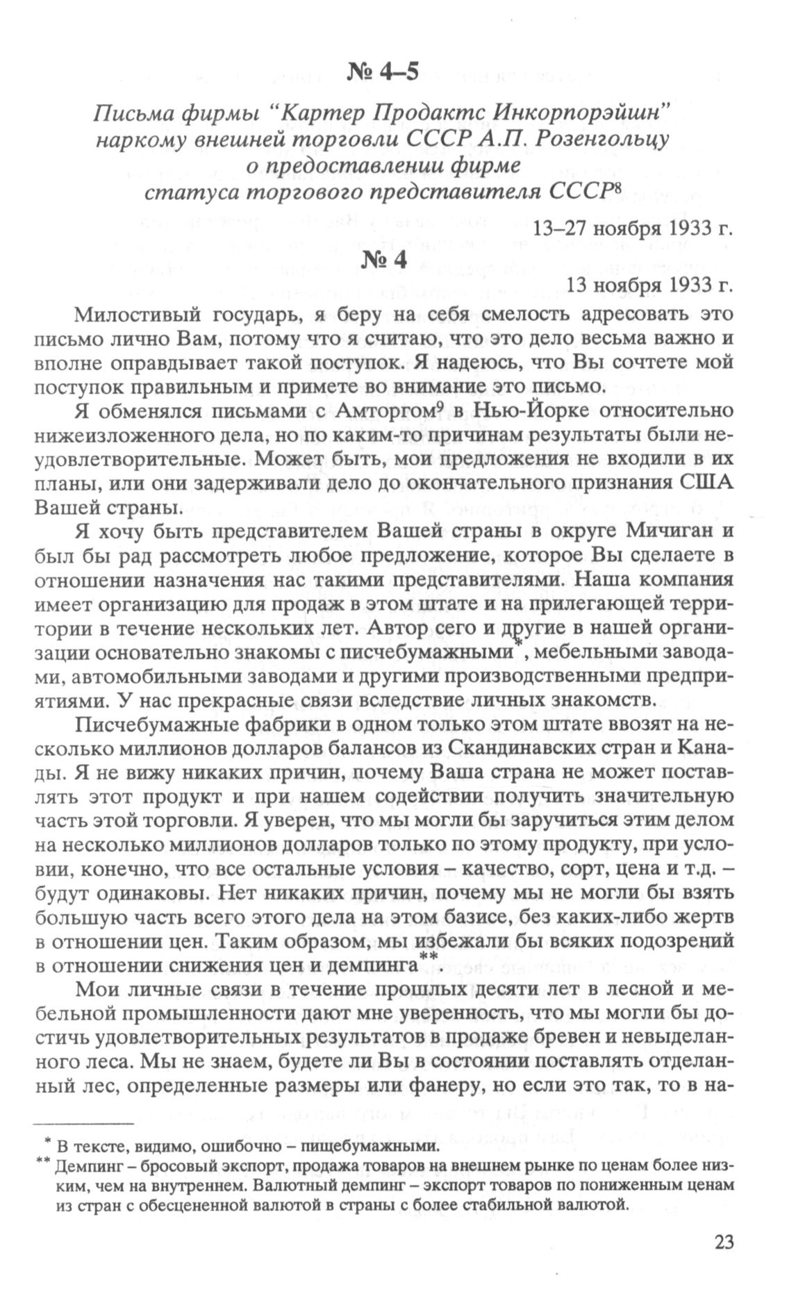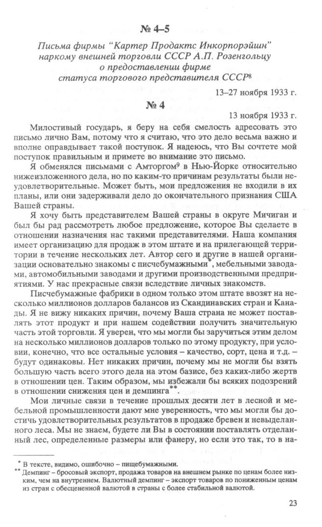 Письмо фирмы «Картер Продактс Инкорпорэйшн» наркому внешней торговли СССР А.П. Розенгольцу о предоставлении фирме статуса торгового представителя СССР. 13 ноября 1933 г. // РГАЭ. Ф. 413. Оп. 13. Д. 546. Л. 1-2. Копия.
