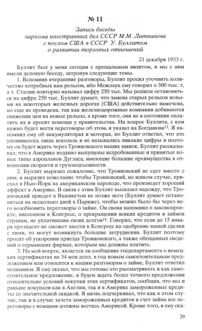 Запись беседы наркома иностранных дел СССР М.М. Литвинова с послом США в СССР У. Буллитом о развитии торговых отношений. 21 декабря 1933 г. // Документы внешней политики СССР. М., 1970. Т. XVI. С. 758-761.