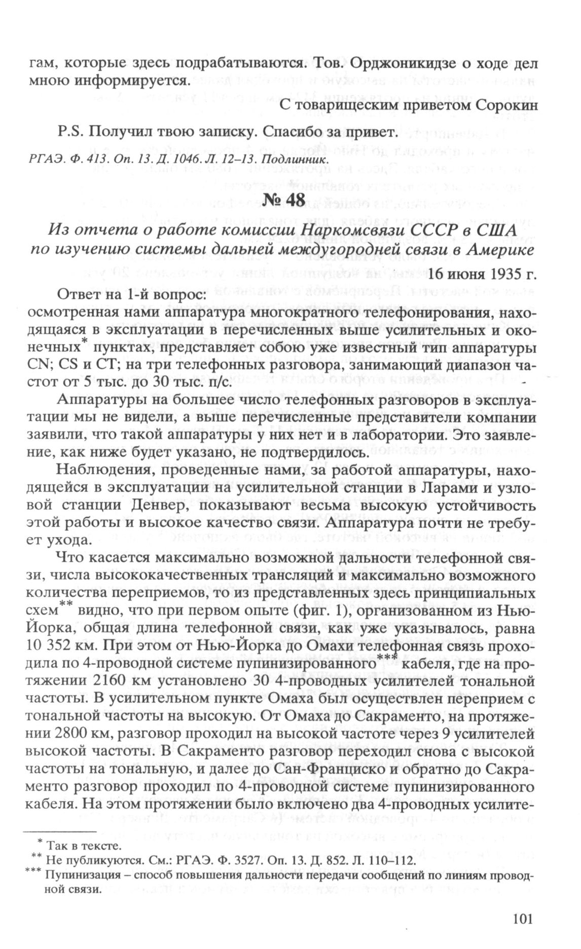 Из отчета о работе комиссии Наркомсвязи СССР в США по изучению системы дальней междугородной связи в Америке. 16 июня 1935 г. // РГАЭ Ф. 3527. Оп. 13. Д. 852. Л 62-68. Подлинник.