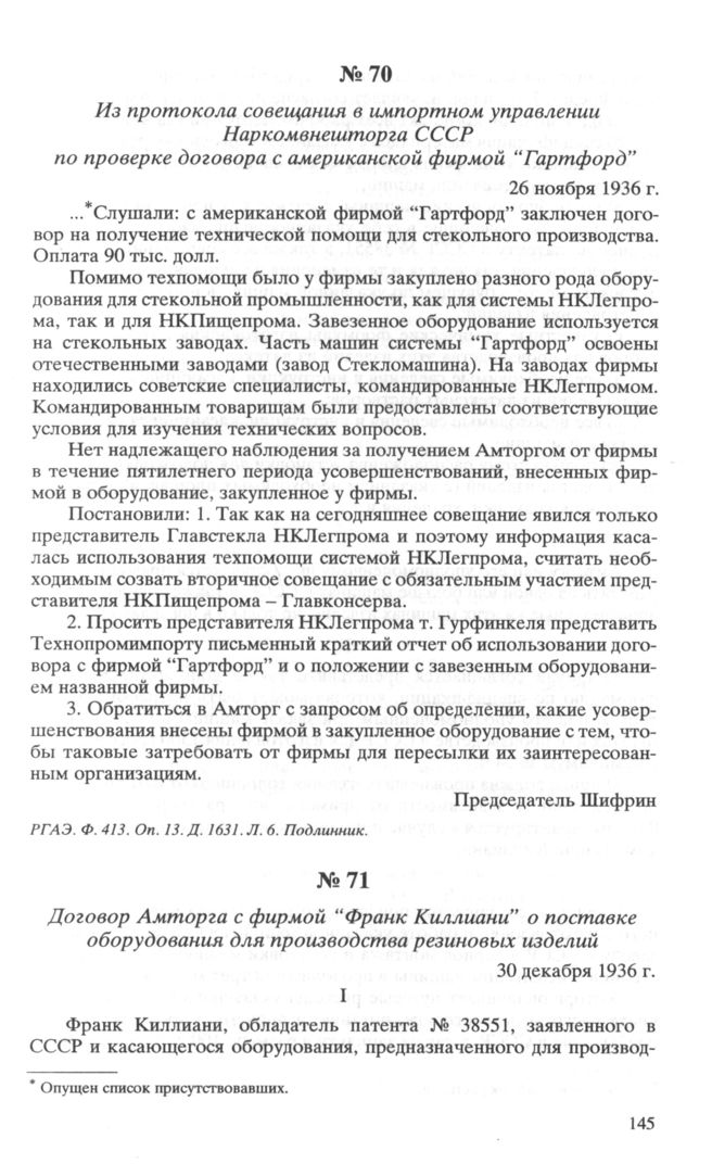 Договор Амторга с фирмой «Франк Киллиани» о поставке оборудования для производства резиновых изделий. 30 декабря 1936 г. // РГАЭ. Ф. 413. Оп. 13. Д. 1999. Л. 7-9. Копия.