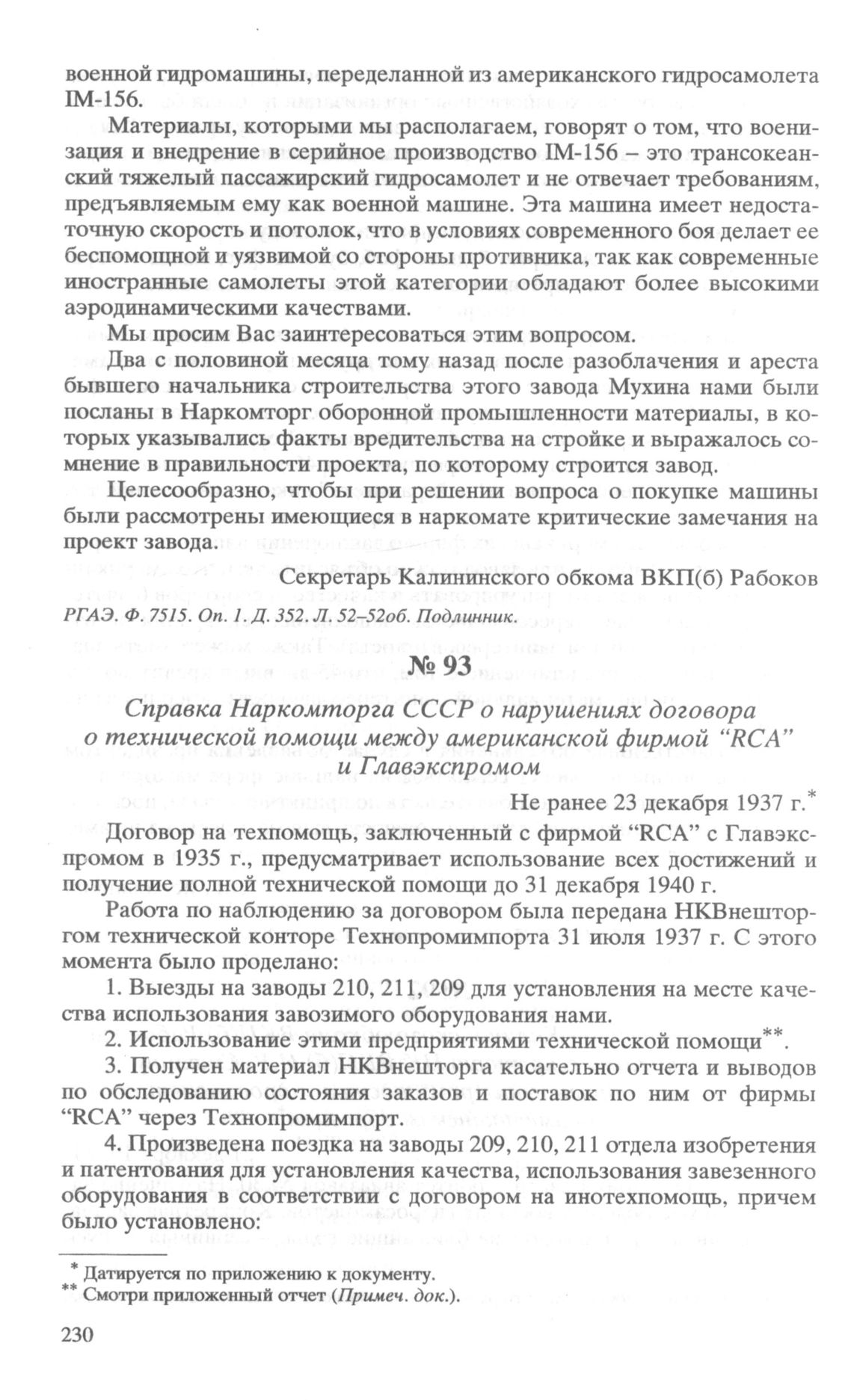 Справка Наркомторга СССР о нарушениях договора о технической помощи между американской фирмой «RCA» и Главэкспромом. Не ранее 23 декабря 1937 г. // РГАЭ. Ф. 413. Оп. 13. Д. 2330. Л. 57-58. Копия.