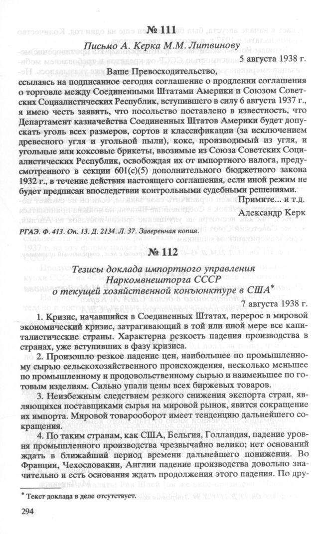 Тезисы доклада импортного управления Наркомвнешторга СССР о текущей хозяйственной конъюнктуре в США. 7 августа 1938 г. // РГАЭ. Ф. 413. Оп. 13. Д. 2041. Л. 30-32. Копия.