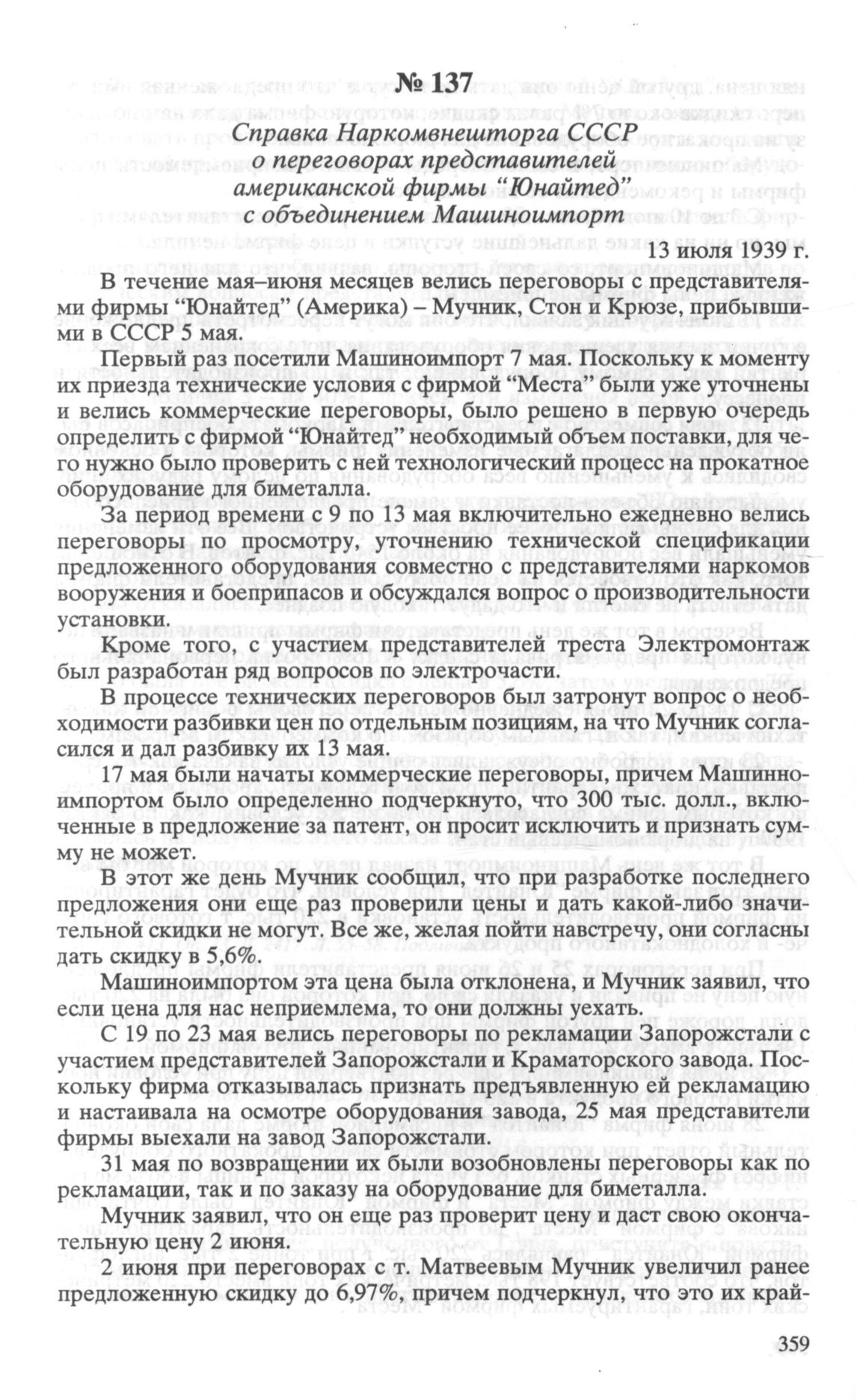 Справка Наркомвнешторга СССР о переговорах представителей американской фирмы «Юнайтед» с объединением Машиноимпорт. 13 июля 1939 г.