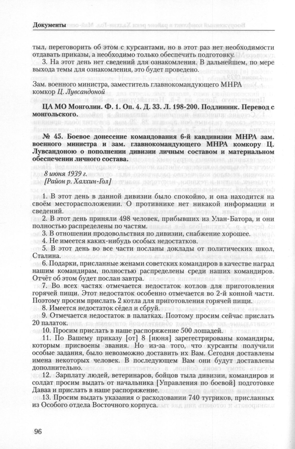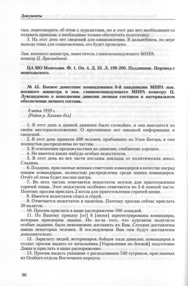Боевое донесение командования 6-й кавдивизии МНРА зам. военного министра и зам. главнокомандующего МНРА комкору Ц. Лувсандоною о пополнении дивизии личным составом и материальном обеспечении личного состава. 8 июня 1939 г. // ЦА МО Монголии. Ф. 1. Оп. 4. Д. 3. Л. 159-160. Подлинник. Перевод с монгольского.