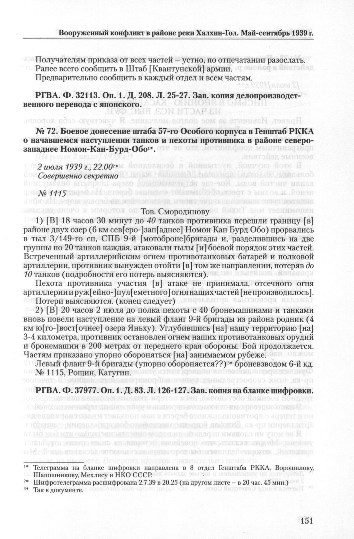 Боевое донесение штаба 57-го Особого корпуса в Генштаб РККА о начавшемся наступлении танков и пехоты противника в районе северо- западнее Номон-Кан-Бурд-Обо. 2 июля 1939 г. // РГВА. Ф. 37977. Oп. 1. Д. 83. Л. 126-127. Зав. копия на бланке шифровки.
