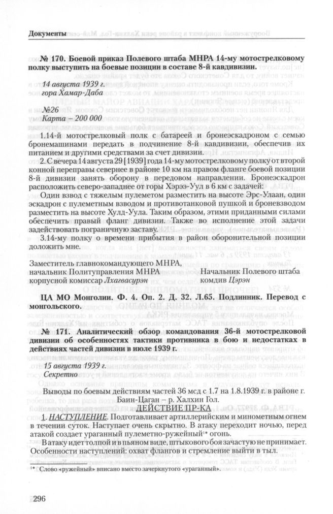 Боевой приказ Полевого штаба МНРА 14-му мотострелковому полку выступить на боевые позиции в составе 8-й кавдивизии. 14 августа 1939 г. // ЦА МО Монголии. Ф. 4. Оп. 2. Д. 32. Л.65. Подлинник. Перевод с монгольского.