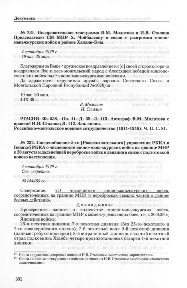 Поздравительная телеграмма В. М. Молотова и И. В. Сталина Председателю СМ МНР X. Чойбалсану в связи с разгромом японо-маньчжурских войск в районе Халхин-Гола. 4 сентября 1939 г. // РГАСПИ. Ф. 558. Оп. 11. Д. 58. Л. 113. Автограф В. М. Молотова с правкой И. В. Сталина; Л. 112. Зав. копия. Российско-монгольское военное сотрудничество (1911-1946). Ч. II. С. 81.
