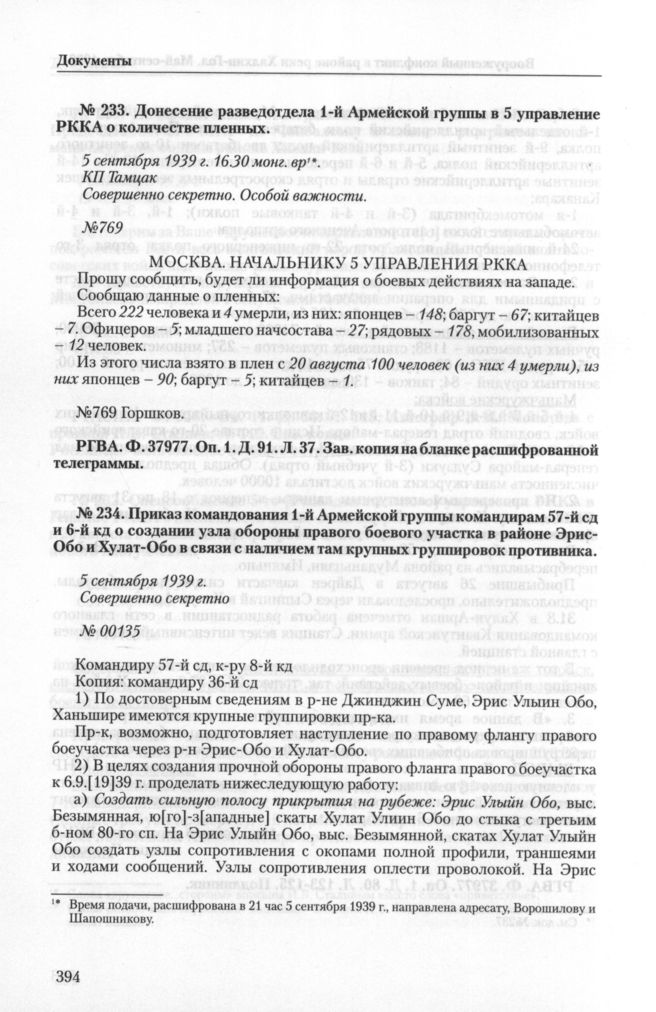 Приказ командования 1-й Армейской группы командирам 57-й сд и 6-й кд о создании узла обороны правого боевого участка в районе Эрис-Обо и Хулат-Обо в связи с наличием там крупных группировок противника. 5 сентября 1939 г. // РГВА. Ф. 32113. Oп. 1. Д. 670. Л. 314-315. Подлинник.