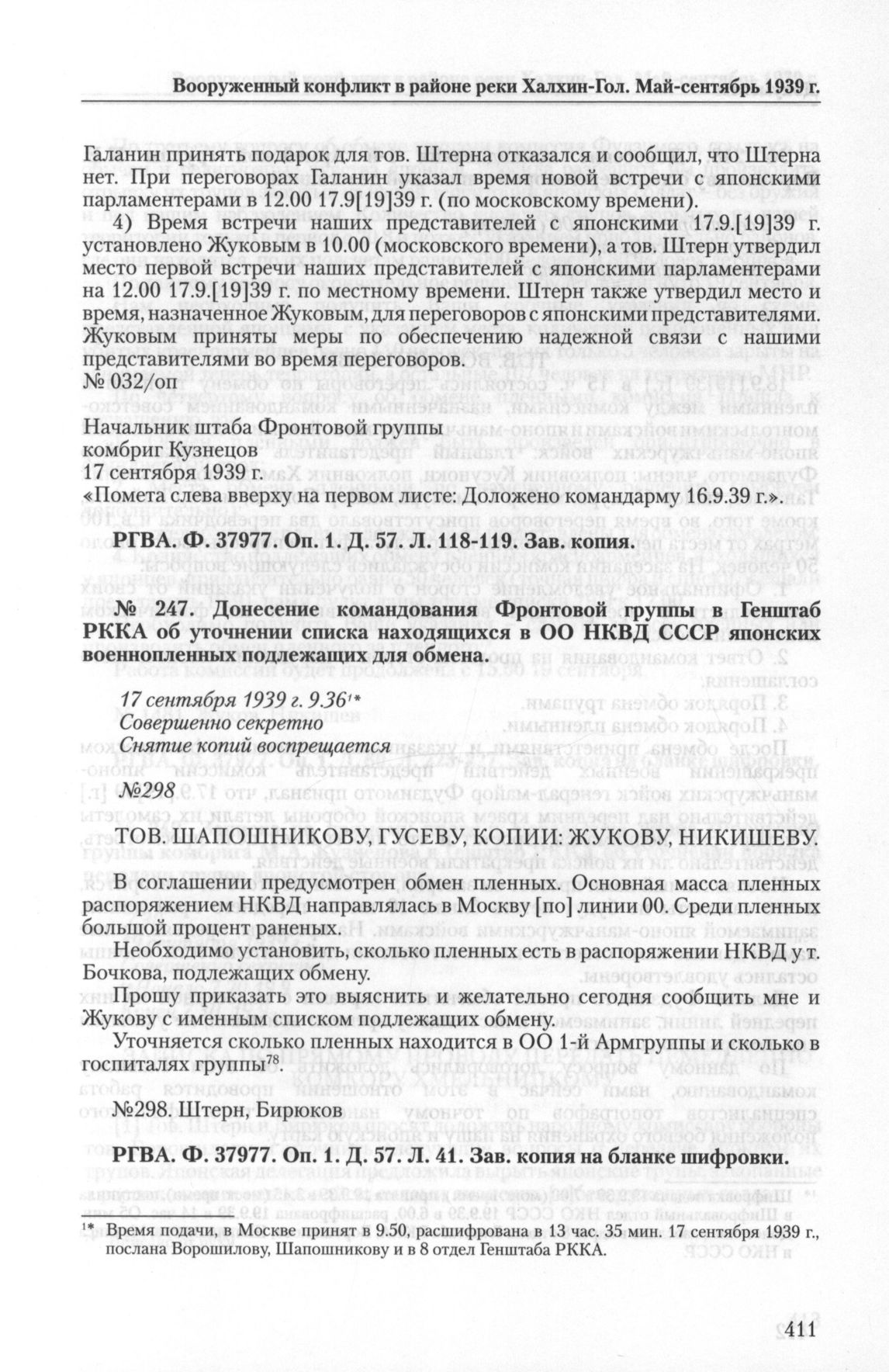 Донесение командования Фронтовой группы в Генштаб РККА об уточнении списка находящихся в ОО НКВД СССР японских военнопленных подлежащих для обмена. 17 сентября 1939 г. // РГВА. Ф. 37977. Oп. 1. Д. 57. Л. 41. Зав. копия на бланке шифровки.