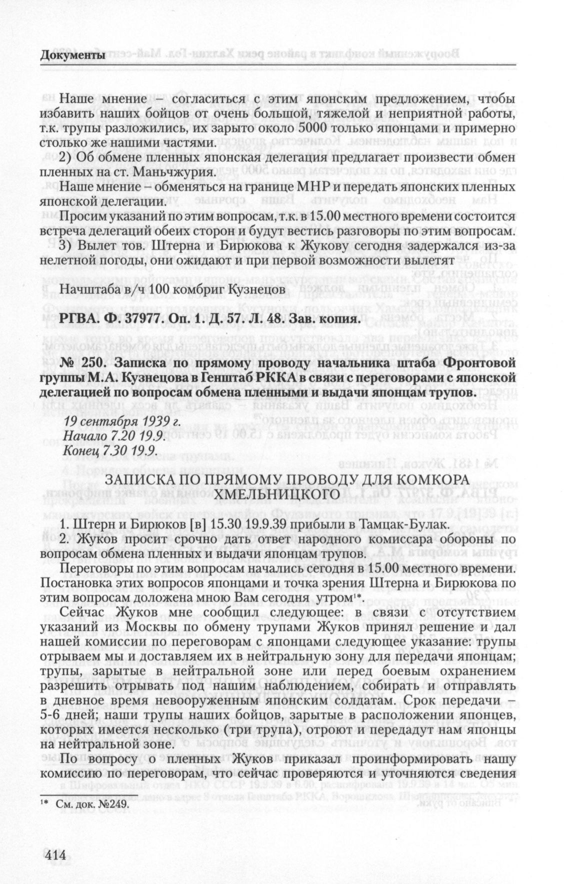 Записка по прямому проводу начальника штаба Фронтовой группы М. А. Кузнецова в Генштаб РККА в связи с переговорами с японской делегацией по вопросам обмена пленными и выдачи японцам трупов. 19 сентября 1939 г. // РГВА. Ф. 37977. Oп. 1. Д. 57. Л. 50-51. Зав. копия.