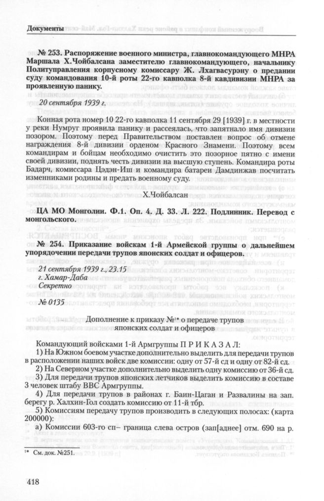 Распоряжение военного министра, главнокомандующего МНРА Маршала Х. Чойбалсана заместителю главнокомандующего, начальнику Политуправления корпусному комиссару Ж. Лхагвасурэну о предании суду командования 10-й роты 22-го кавполка 8-й кавдивизии МНРА за проявленную панику. 20 сентября 1939 г. // ЦА МО Монголии. Ф.1. Оп. 4. Д. 33. Л. 222. Подлинник. Перевод с монгольского.