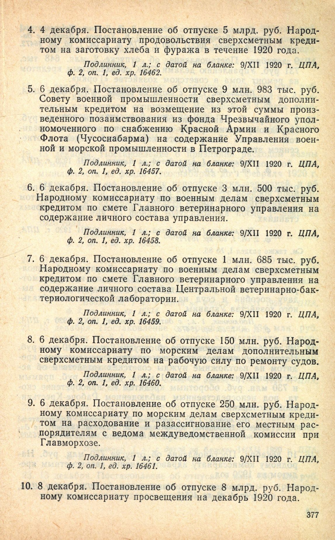 4 декабря. Постановление об отпуске 5 млрд. руб. Народному комиссариату продовольствия сверхсметным кредитом на заготовку хлеба и фуража в течение 1920 года.