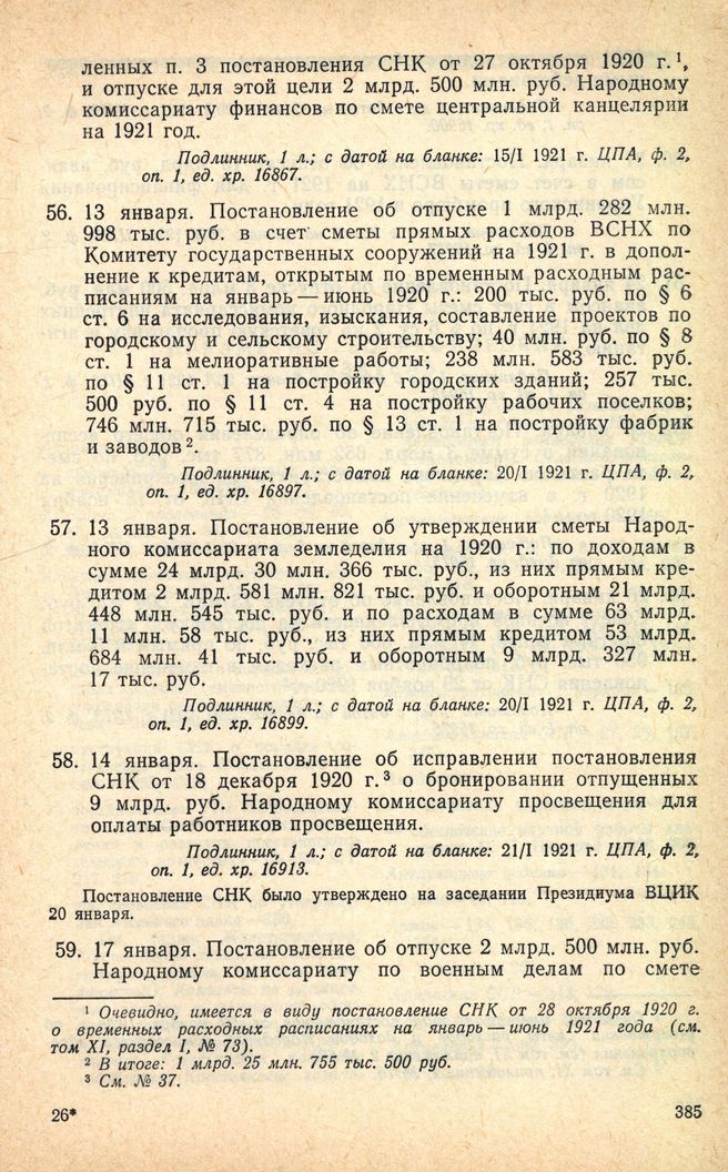 13 января. Постановление об утверждении сметы Народного комиссариата земледелия на 1920 г.: по доходам в сумме 24 млрд. 30 млн. 366 тыс. руб., из них прямым кредитом 2 млрд. 581 млн. 821 тыс. руб. и оборотным 21 млрд. 448 млн. 545 тыс. руб. и по р...