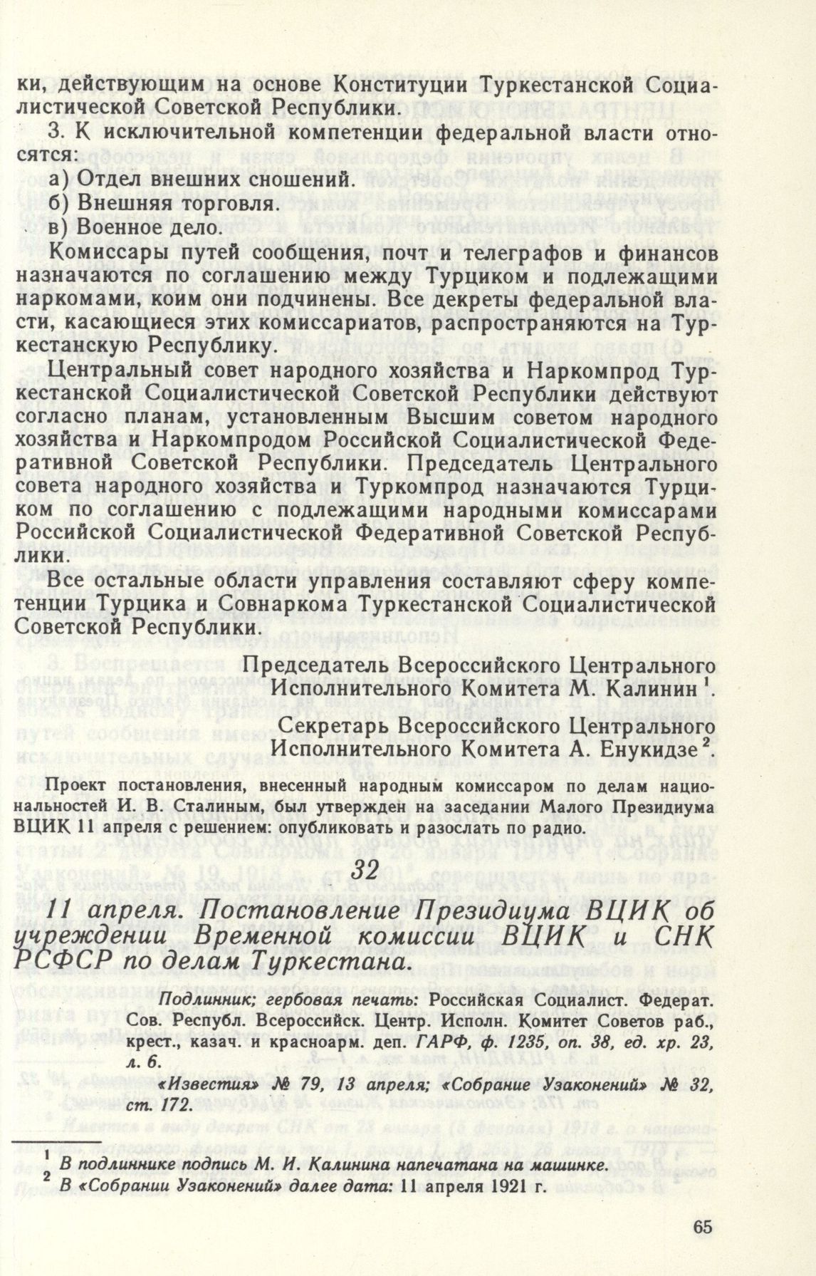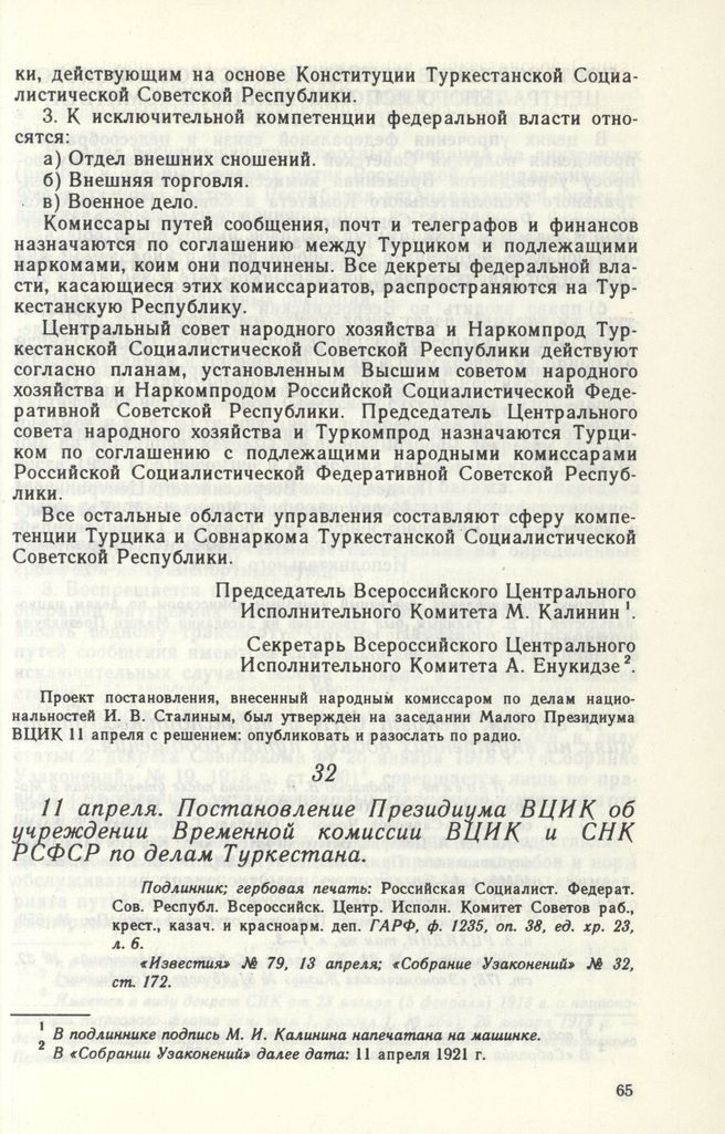 11 апреля. Постановление Президиума ВЦИК об учреждении Временной комиссии ВЦИК и СНК РСФСР по делам Туркестана // Подлинник; гербовая печать: Российская Социалист. Федерат. Сов. Республ. Всероссийск. Центр. Исполн. Комитет Советов раб., крест., казан, и красноарм. деп. ГАРФ, ф. 1235, оп. 38, ед. хр. 23, л. 6. «Известия» № 79, 13 апреля; «Собрание Узаконений» № 32, ст. 172.