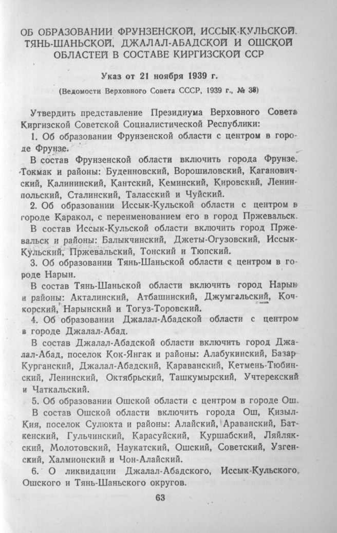 Об образовании Фрунзенской, Иссык-Кульской, Тянь-Шаньской, Джалал-Абадской и Ошской областей в составе Киргизской ССР (Указ от 21 ноября 1939 г.) // Ведомости Верховного Совета СССР, 1939 г., № З8.