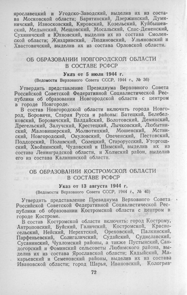 Об образовании Костромской области в составе РСФСР (Указ от 13 августа 1944 г.) // Ведомости Верховного Совета СССР, 1944 г., № 43.