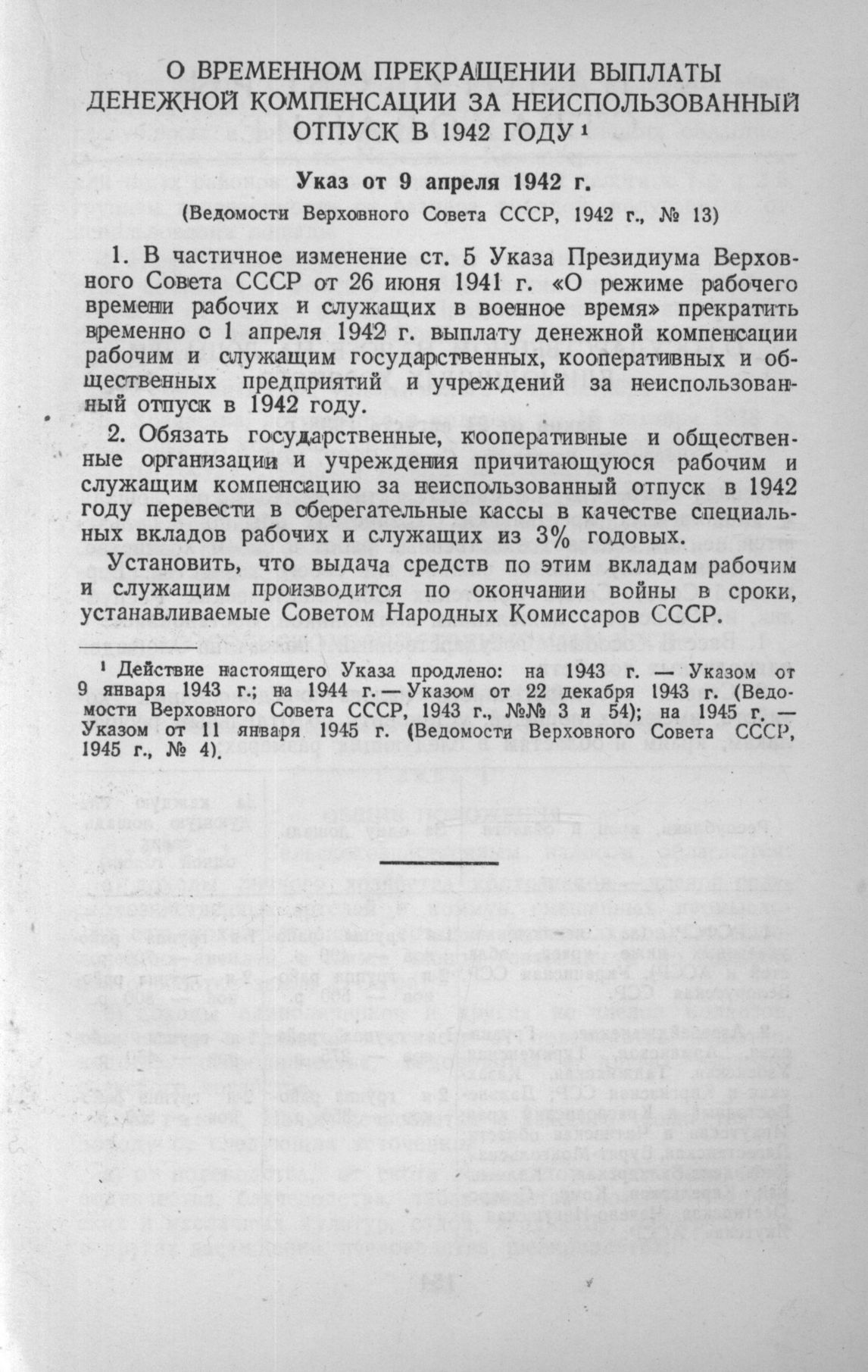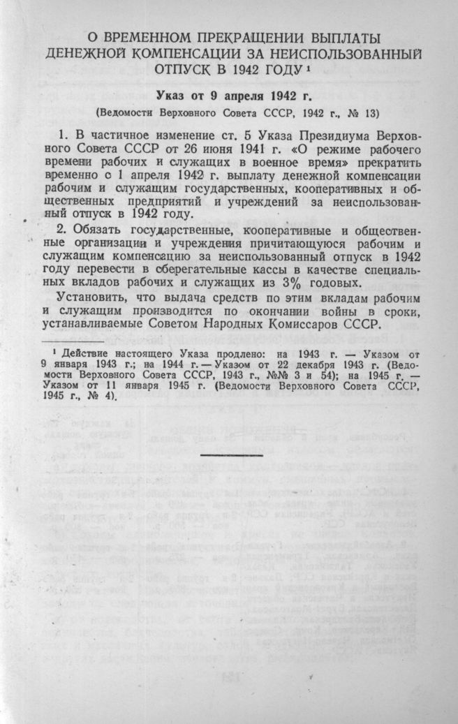 О временном прекращении выплаты денежной компенсации за неиспользованный отпуск в 1942 г. (Указ от 9 апреля 1942 г.) // Ведомости Верховного Совета СССР, 1942 г., № 13.