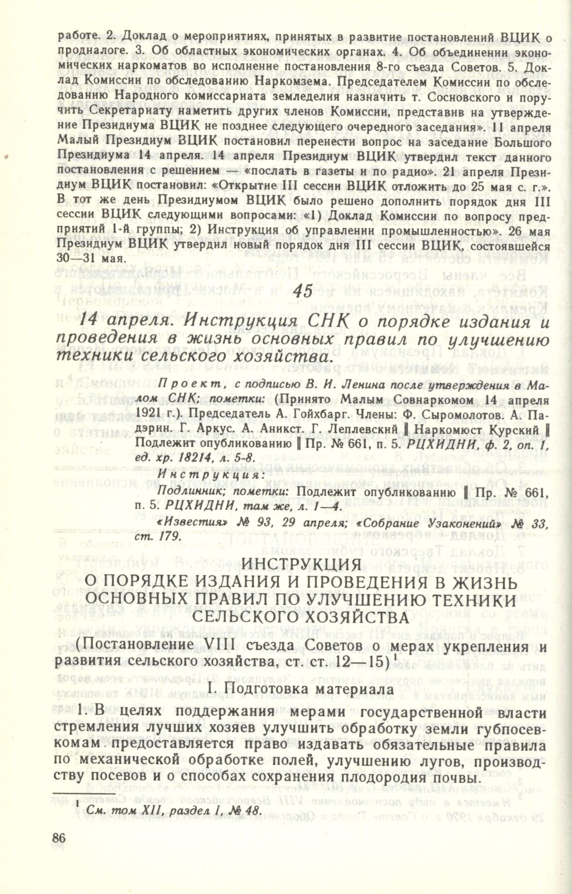 14 апреля. Инструкция СНК о порядке издания и проведения в жизнь основных правил по улучшению техники сельского хозяйства // Проект, с подписью В. И. Ленина после утверждения в Малом СНК: пометки: (Принято Малым Совнаркомом 14 апреля 1921 г.). Председатель А. Гойхбарг. Члены: Ф. Сыромолотов. А. Падэрин. Г. Аркус. А. Аникст. Г. Леплевский || Наркомюст Курский || Подлежит опубликованию || Пр. № 661, п. 5. РЦХИДНИ, ф. 2. оп. 1, ед. хр. 18214, л. 5-8. Инструкция: Подлинник; пометки: Подлежит опубликованию || Пр. № 661, п. 5. РЦХИДНИ. там же, л. 1—4. «Известия» № 93, 29 апреля; «Собрание Узаконений» № 33, ст. 179.