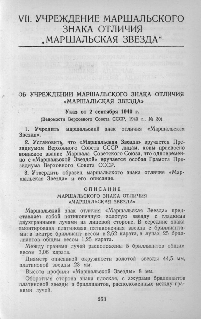 Об учреждении маршальского знака отличия «Маршальская Звезда» (Указ от 2 сентября 1940 г.) // Ведомости Верховного Совета СССР, 1940 г., № 30.