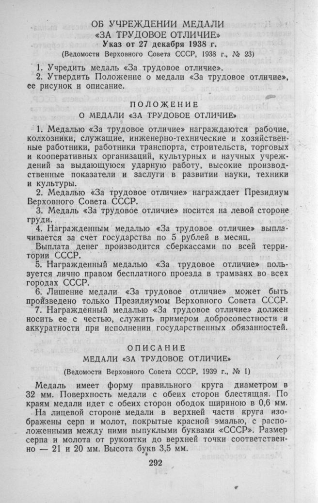 Об учреждении медали «За трудовое отличие» (Указ от 27 декабря 1938 г.) // Ведомости Верховного Совета СССР, 1938 г., № 23; Ведомости Верховного Совета СССР, 1939 г., № 1.