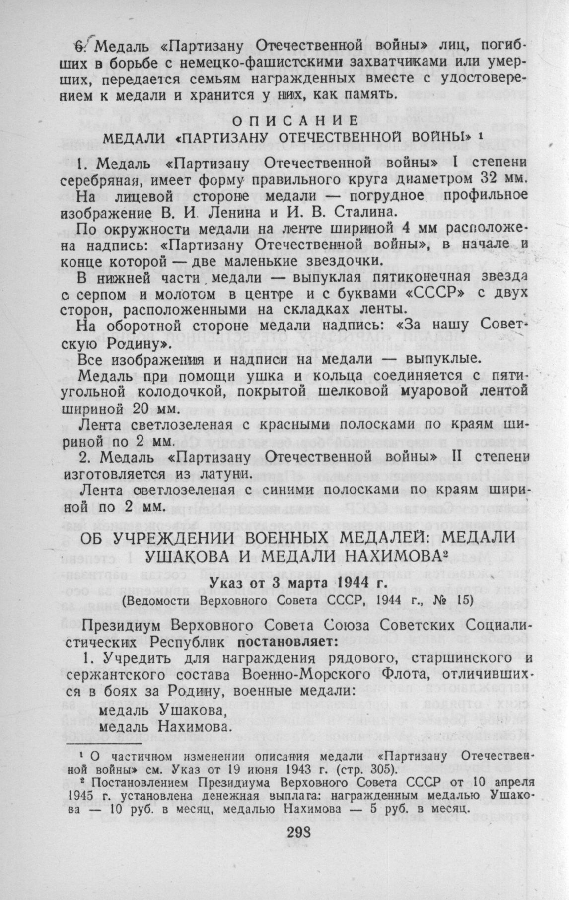 Об учреждении военных медалей: медали Ушакова и медали Нахимова (Указ от 3 марта 1944 г.) // Ведомости Верховного Совета СССР, 1944 г., № 15.