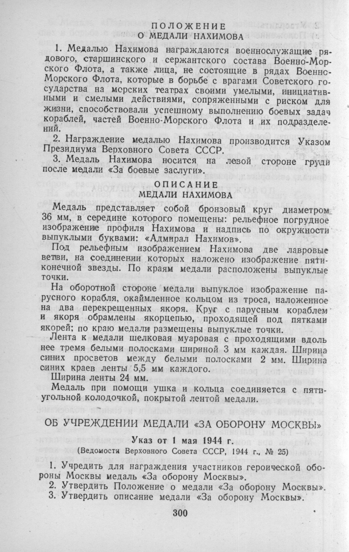Об учреждении медали «За оборону Москвы» (Указ от 1 мая 1944 г.) // Ведомости Верховного Совета СССР, 1944 г., № 25.