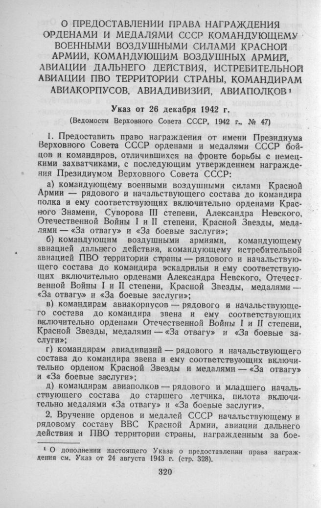 О предоставлении права награждения орденами и медалями СССР командующему военными воздушными силами Красной Армии, командующим воздушных армий, авиации дальнего действия, истребительной авиации ПВО территории страны, командирам авиакорпусов, авиадивизий, авиаполков (Указ от 26 декабря 1942 г.) // Ведомости Верховного Совета СССР, 1942 г., № 47.
