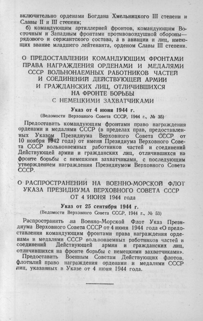 О распространении на Военно-Морской Флот Указа Президиума Верховного Совета СССР от 4 июня 1944 г. (Указ от 25 сентября 1944 г.) // Ведомости Верховного Совета СССР, 1944 г., № 53.