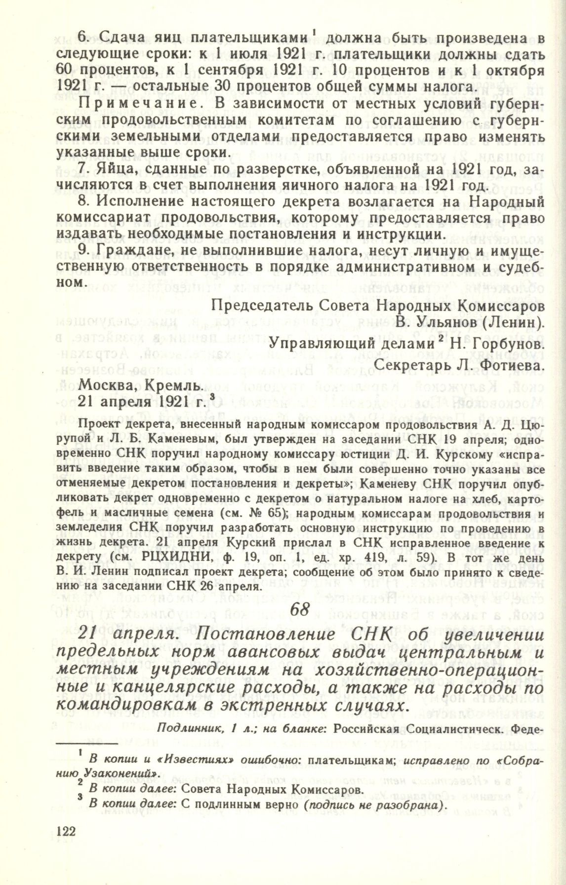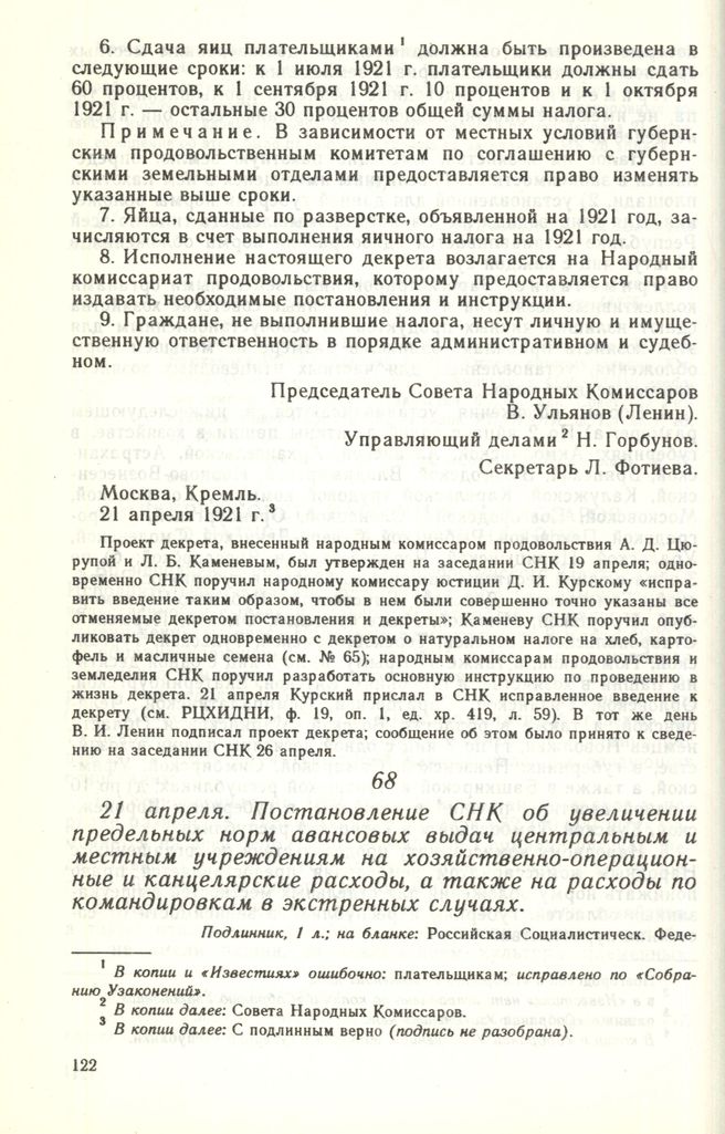21 апреля. Постановление СНК об увеличении предельных норм авансовых выдач центральным и местным учреждениям на хозяйственно-операционные и канцелярские расходы, а также на расходы по командировкам в экстренных случаях // Подлинник, 1 л.; на бланке: Российская Социалистическ. Федеративн. Советская Республика. Совет Народных Комиссаров. Москва, Кремль; с датой и номером: 22/IV 1921 г. № а 4196; пометки: ВНК финансов || Пр. № 665, п. 15; гербовая печать: Российская Социалистич. Федеративн. Советская Республика. Совет Народных Комиссаров. РЦХИДНИ, ф. 2, оп. 1, ед. хр. 18344. «Сборник приказов Революционного военного совета Республики 1921 г.», приказ № 1097, 19 мая.