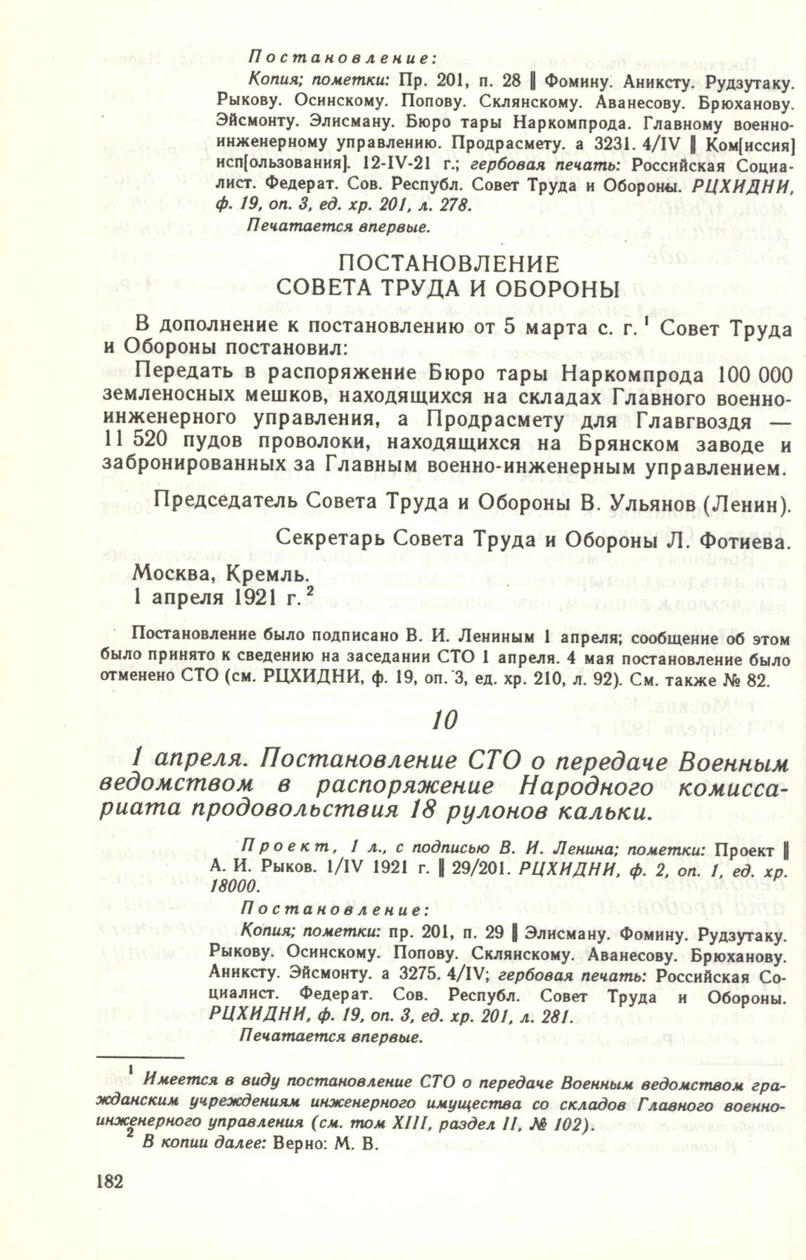 1 апреля. Постановление СТО о передаче Военным ведомством в распоряжение Народного комиссариата продовольствия 18 рулонов кальки // Проект, 1 л., с подписью В. И. Ленина; пометки: Проект || А. И. Рыков. 1/IV 1921 г. || 29/201. РЦХИДНИ, ф. 2, оп. 1. ед. хр. 18000. Постановление: Копия: пометки: пр. 201, п. 29 || Элисману. Фомину. Рудзутаку. Рыкову. Осинскому. Попову. Склянскому. Аванесову. Брюханову. Аниксту. Эйсмонту. а 3275. 4/IV; гербовая печать: Российская Социалист. Федерат. Сов. Республ. Совет Труда и Обороны. РЦХИДНИ. ф. 19, оп. 3, ед. хр. 201. л. 281. Печатается впервые.