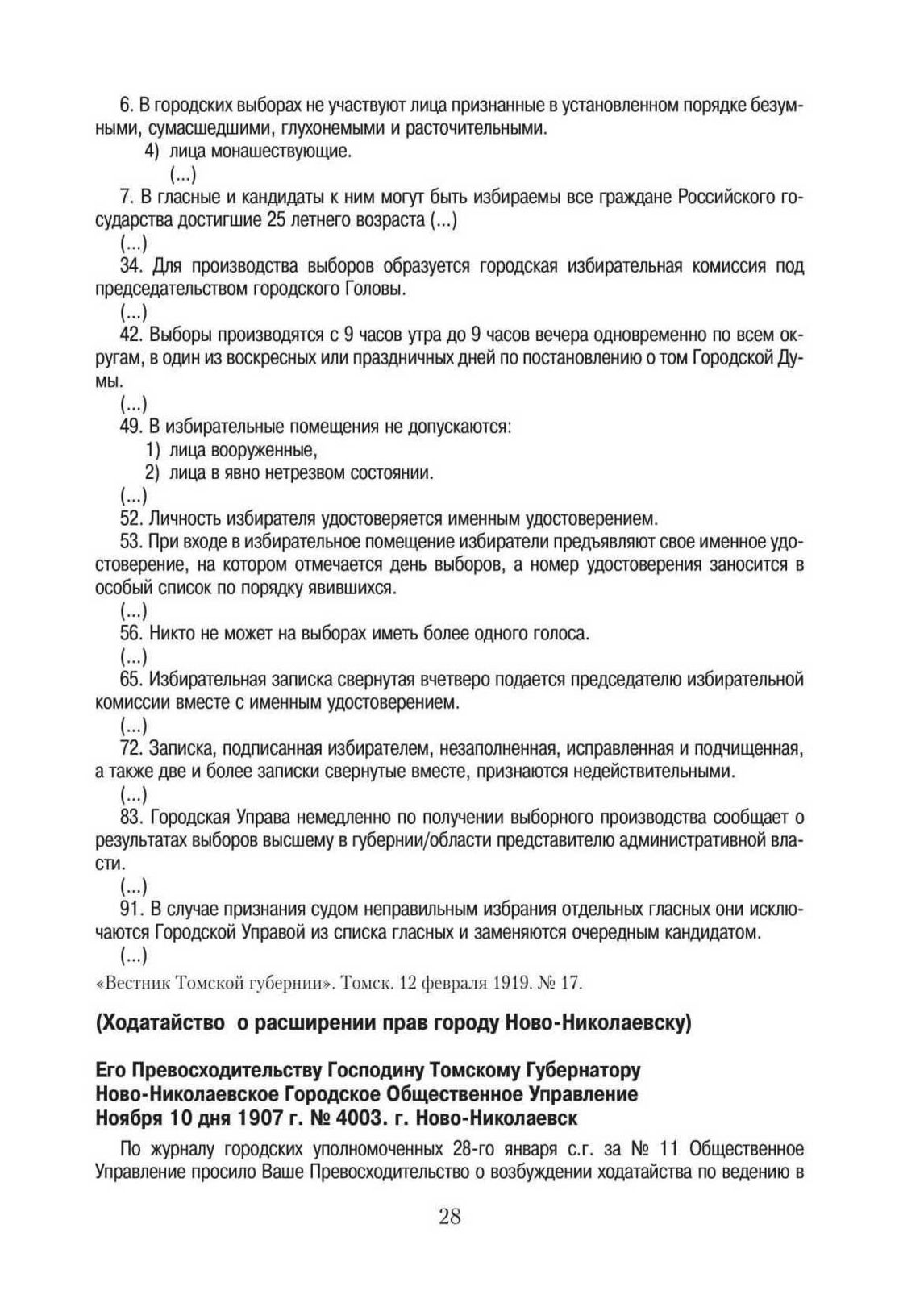 Ходатайство о расширении прав городу Ново-Николаевску. Его Превосходительству Господину Томскому Губернатору Ново-Николаевское Городское Общественное Управление. Ноября 10 дня 1907 г. № 4003. г. Ново-Николаевск // ГАНО. Ф. Д–97. Оп. 1. Д. 1. Л. 69–70. Копия.