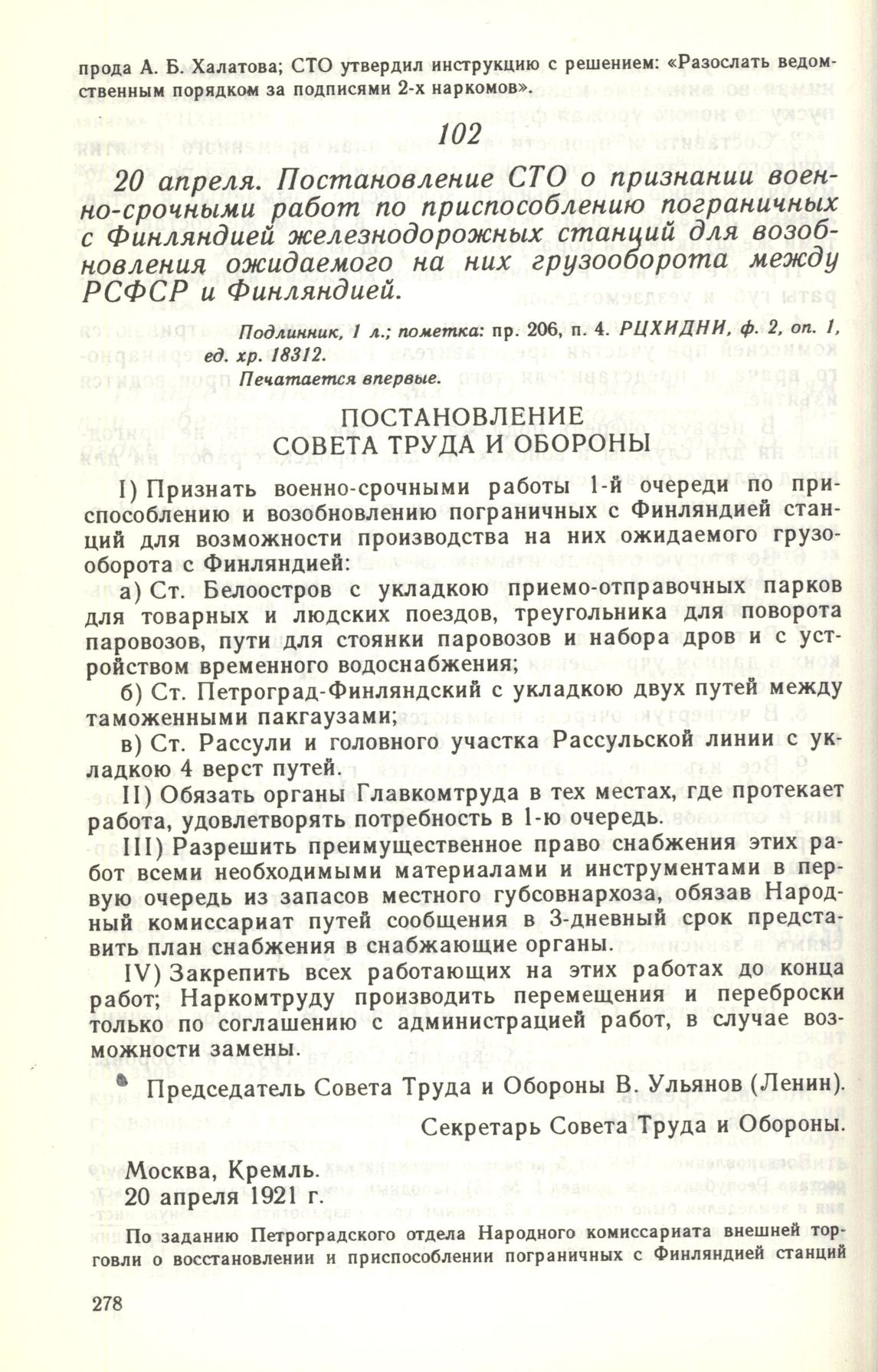 20 апреля. Постановление СТО о признании военно-срочными работ по приспособлению пограничных с Финляндией железнодорожных станций для возобновления ожидаемого на них грузооборота между РСФСР и Финляндией // Подлинник, 1 л.; пометка: пр. 206, п. 4. РЦХИДНИ, ф. 2, оп. 1, ед. хр. 18312. Печатается впервые.