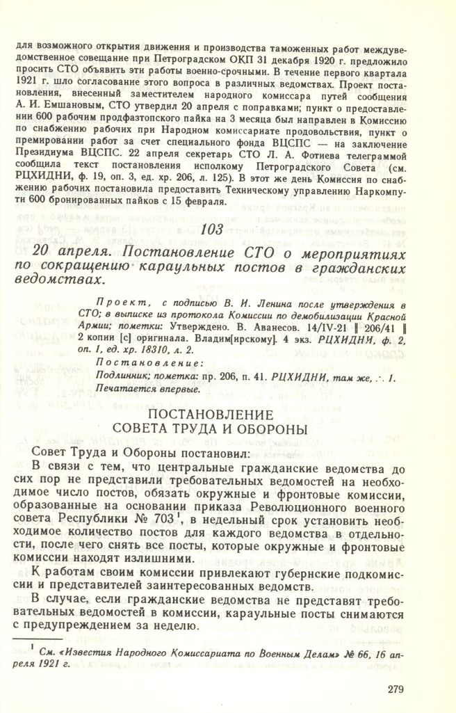 20 апреля. Постановление СТО о мероприятиях по сокращению караульных постов в гражданских ведомствах // Проект, с подписью В. И. Ленина после утверждения в СТО; в выписке из протокола Комиссии по демобилизации Красной Армии; пометки: Утверждено. В. Аванесов. 14/IV-21 || 206/41 || 2 копии [с] оригинала. Влад[имирскому]. 4 экз. РЦХИДНИ, ф. 2, оп. 1, ед. хр. 18310, л. 2. Постановление: Подлинник; пометка: пр. 206, п. 41. РЦХИДНИ, там же, л. 1. Печатается впервые.