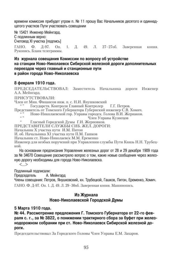 Из журнала совещания Комиссии по вопросу об устройстве на станции Ново-Николаевск Сибирской железной дороги дополнительных переездов через главный и станционные пути в район города Ново-Николаевска. 8 февраля 1910 года // ГАНО. Ф. Д-97. Оп. 1. Д. 49. Л. 29–30об. Заверенная копия. Машинопись.